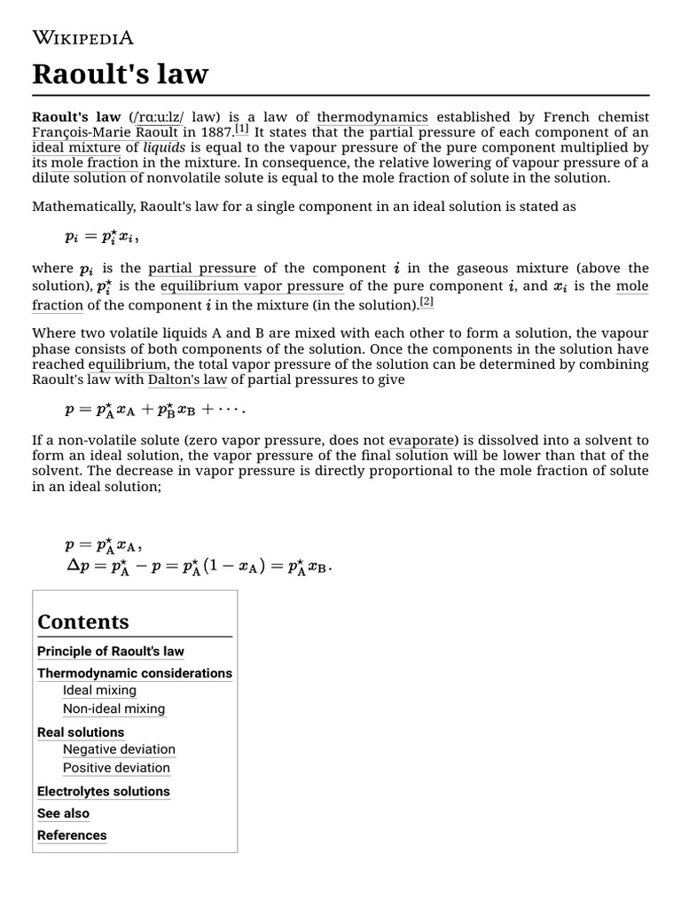 Raoult's law gives a method of estimating the composition and pressure of the vapour above a liquid mixture. Raoult's law states that the vapor pressure of a solvent above a solution is equal to the vapor pressure of the pure solvent at the same temperature scaled by the mole fraction of the solvent present.… This article describes the basis of raoult's law and provides an example of how to apply it. For a solution, raoult's law relates the relative concentrations of the components in solution with their relative vapor pressures above the solution. Both raoult's law and henry's law have a form of an equilibrium constant in which the particles are going from the ideal liquid phase to the ideal gas phase.